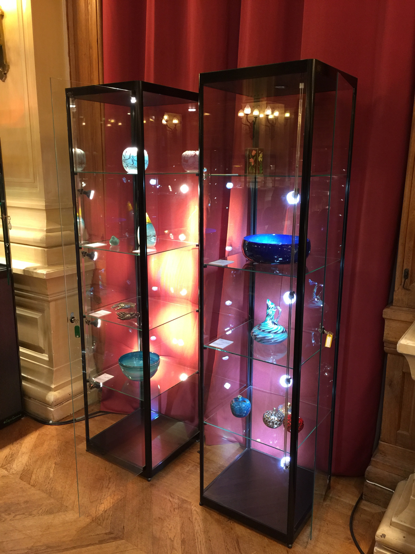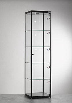 H 2000 L 500 P 500 , profil aluminium laqué noire , 4 étagères , 1 porte ouvrante avec serrure , 1 spots led haut et un rail latéral de 4 spots led
