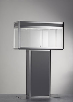 H 1800 L 1100 P 500 sur pieds , finition argent et gris , 8 spots 50 w , socle interieur gainé , 2 portes coulissantes hautes avec serrure , coffre de rangement en dessous avec serrure