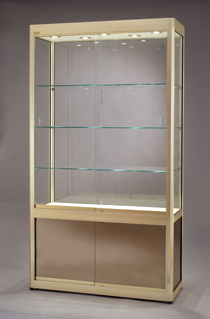 H 1800 L 1000 P 380 , profil aluminium anodisé champagne , cinq spots halogènes 50 w , quatre étagères 8mm , deux portes coulissantes , une serrure , un coffre de rangement avec serrure