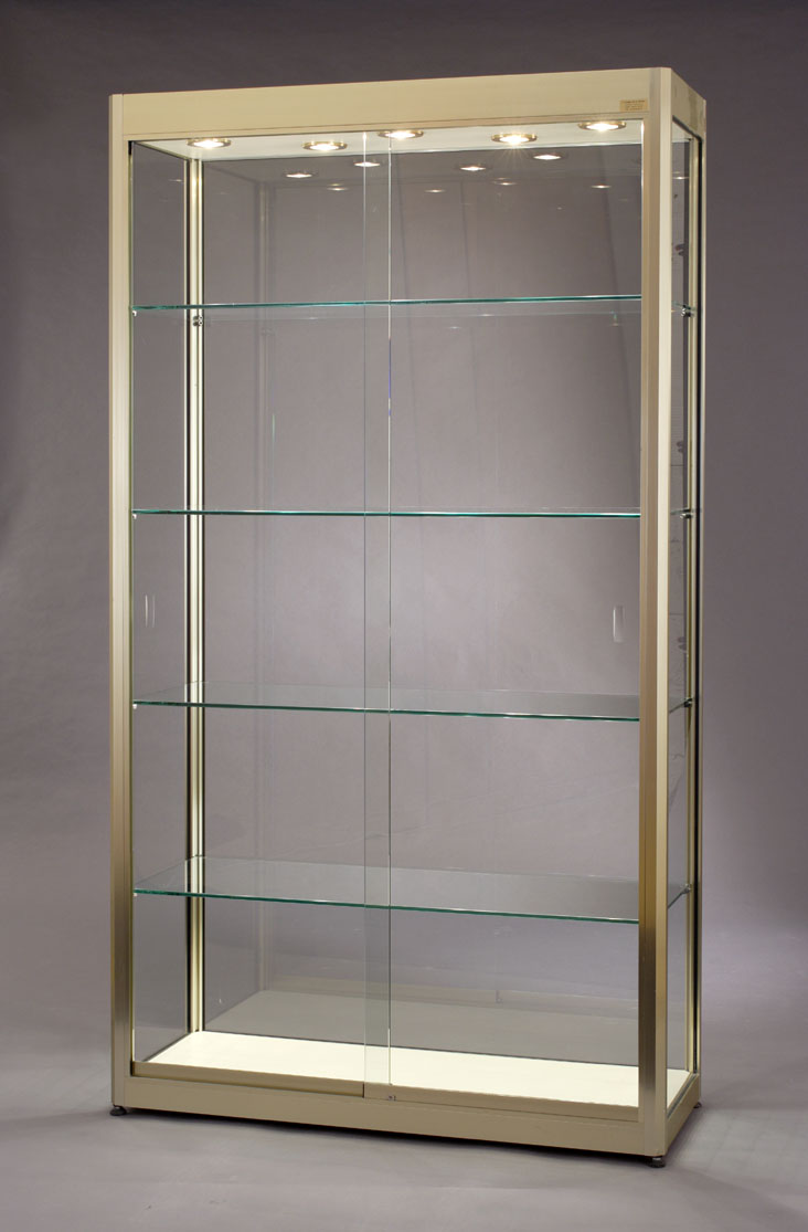 H 1800 L 1000 P 380 , profil aluminium anodisé champagne , 5 spots halogènes 50 w au plafonnier et un rail latéral de 4 spots 20 w , 4 étagères 8mm , 2 portes coulissantes , 1 serrure