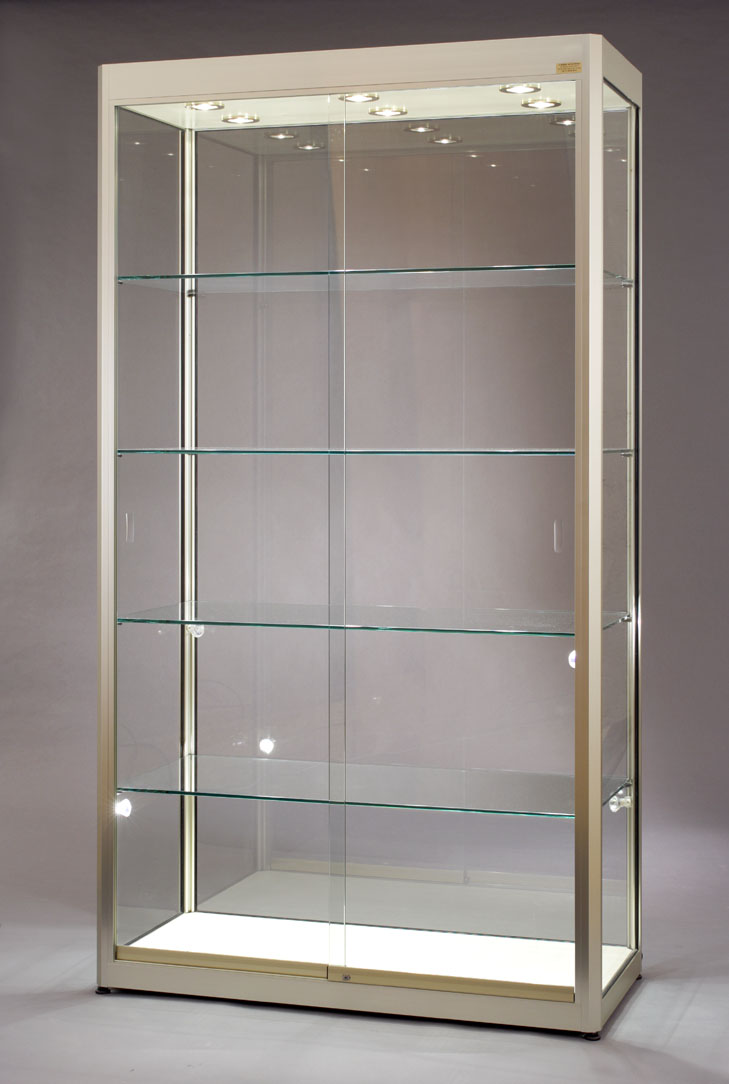 H 1800 L 1000 P 450 , profil aluminium anodisé champagne , 6 spots 50 w au plafonnier + 1 rail de 4 spots 20 w par étagère, 4 étagères 8mm , 2 portes coulissantes , 1 serrure,