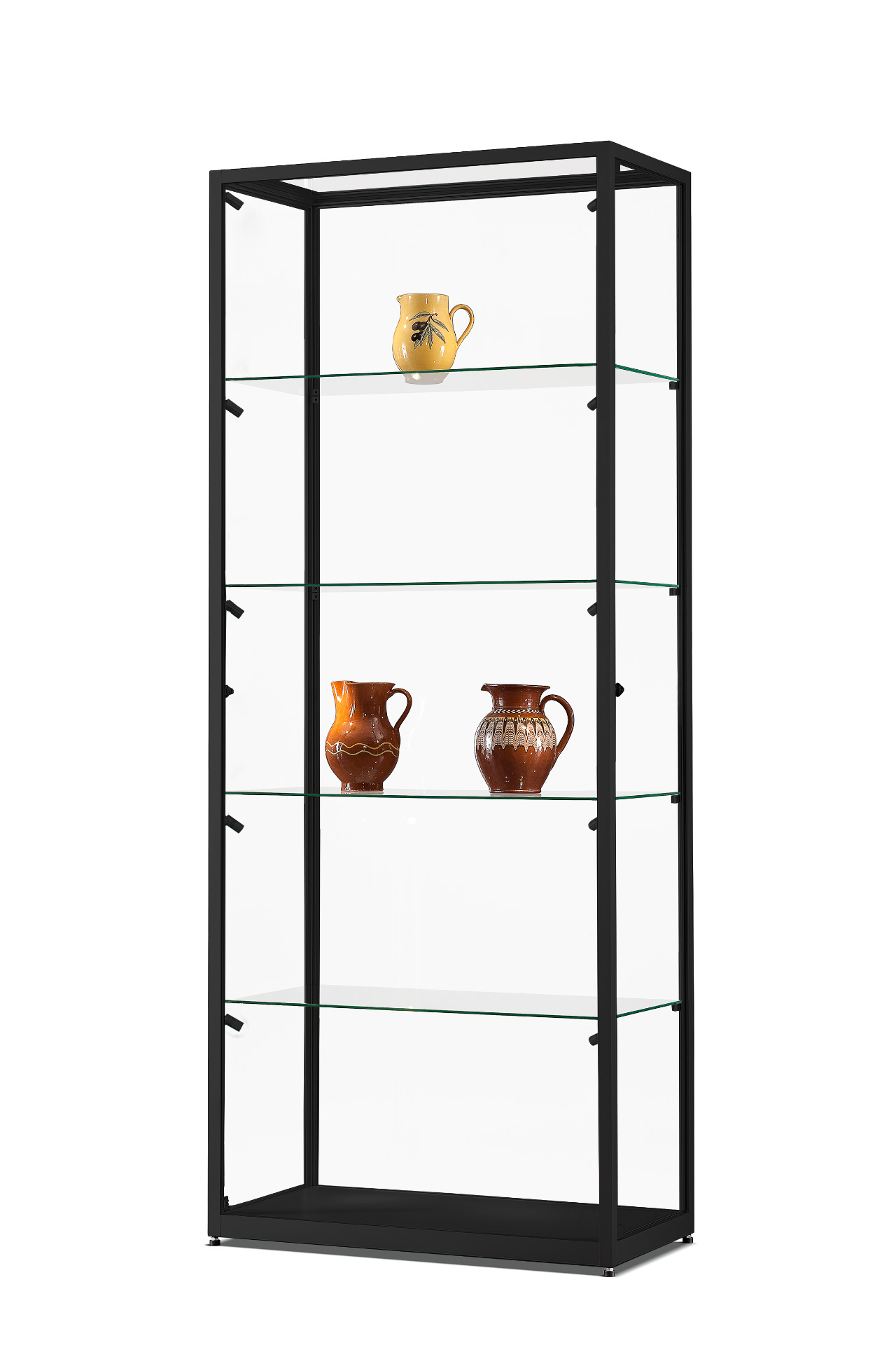 H 1984 L 800 P 400 Profilé carré en aluminium 24 mm • Profilés en croix : bas 40 mm / haut 24 mm • Éclairage LED sur rail clipsable, réglable • Étagères réglables • Socle en bois gris clair ou noir • Entièrement assemblée