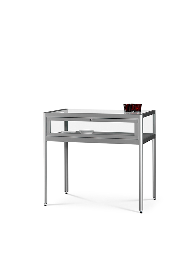 Vitrine comptoir H 920 L 1000 P 600 profil aluminium anodisé argent, une porte ouvrante anti poussière avec serrure